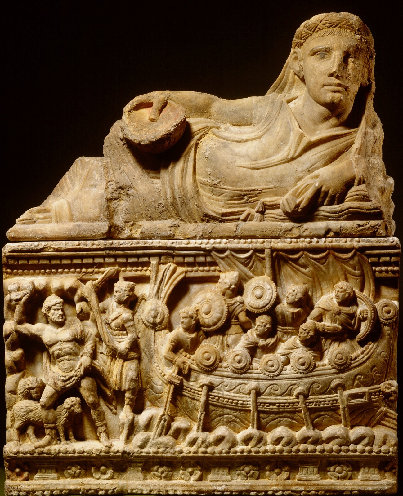 Etruskische askist uit Volterra met afbeelding van Odysseus en de Cycloop, 200 - 50 v. Chr.