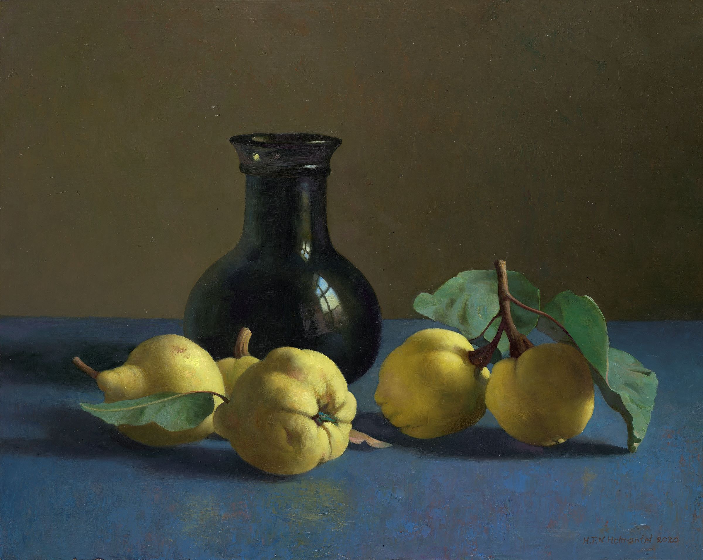 Henk Helmantel (1945), Stilleven met kweeperen en zaadflesje op blauw, 2020, olieverf op doek